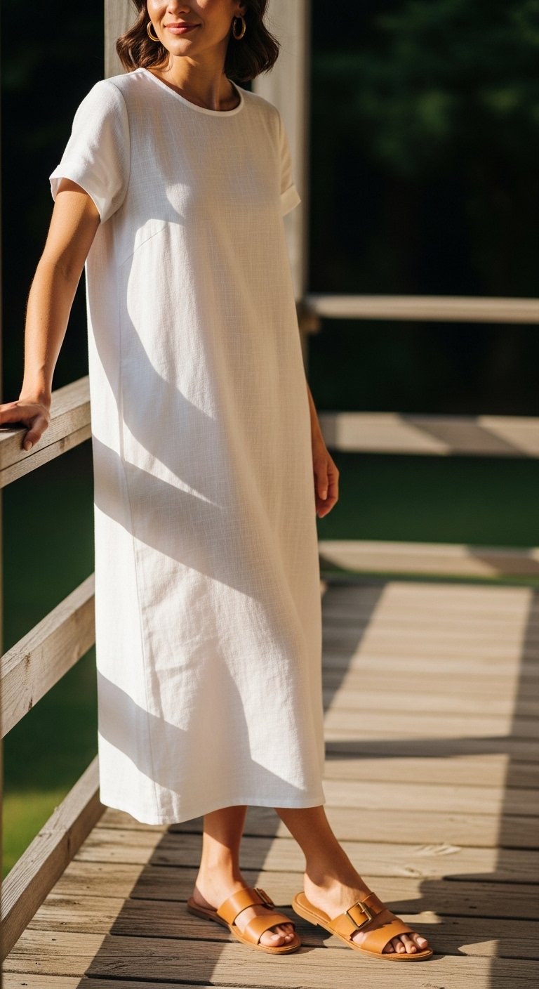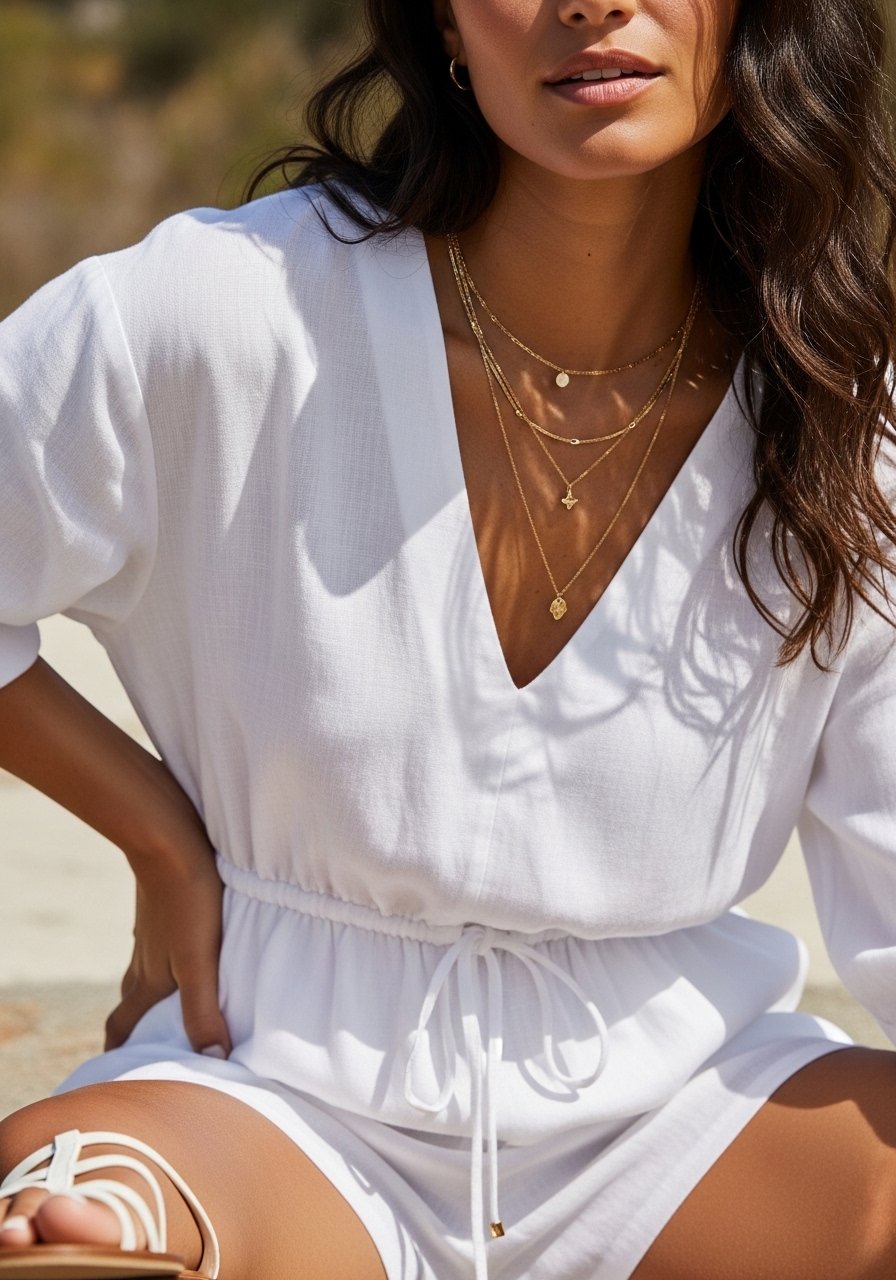 I use one or two textured pieces and one small color anchor—a tan bag, a leather belt, or a gold necklace. I keep jewelry simple and visible; a medium-weight gold chain pops nicely against white. Texture (linen, crepe, soft leather) prevents the outfit from looking flat.