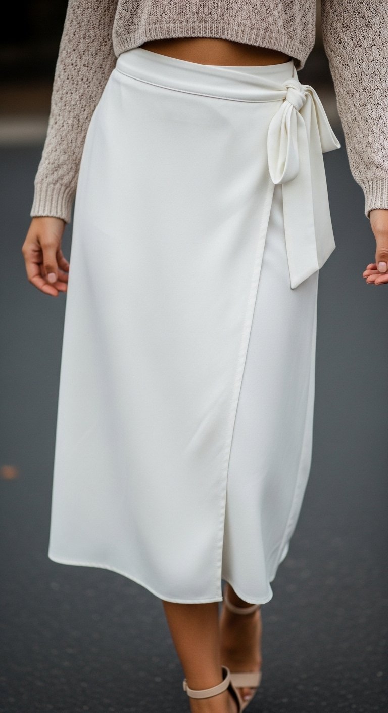 I learned that tighter knits can show lumps—so I pick slightly looser knits that skim, not cling. The skirt’s slit keeps movement natural.