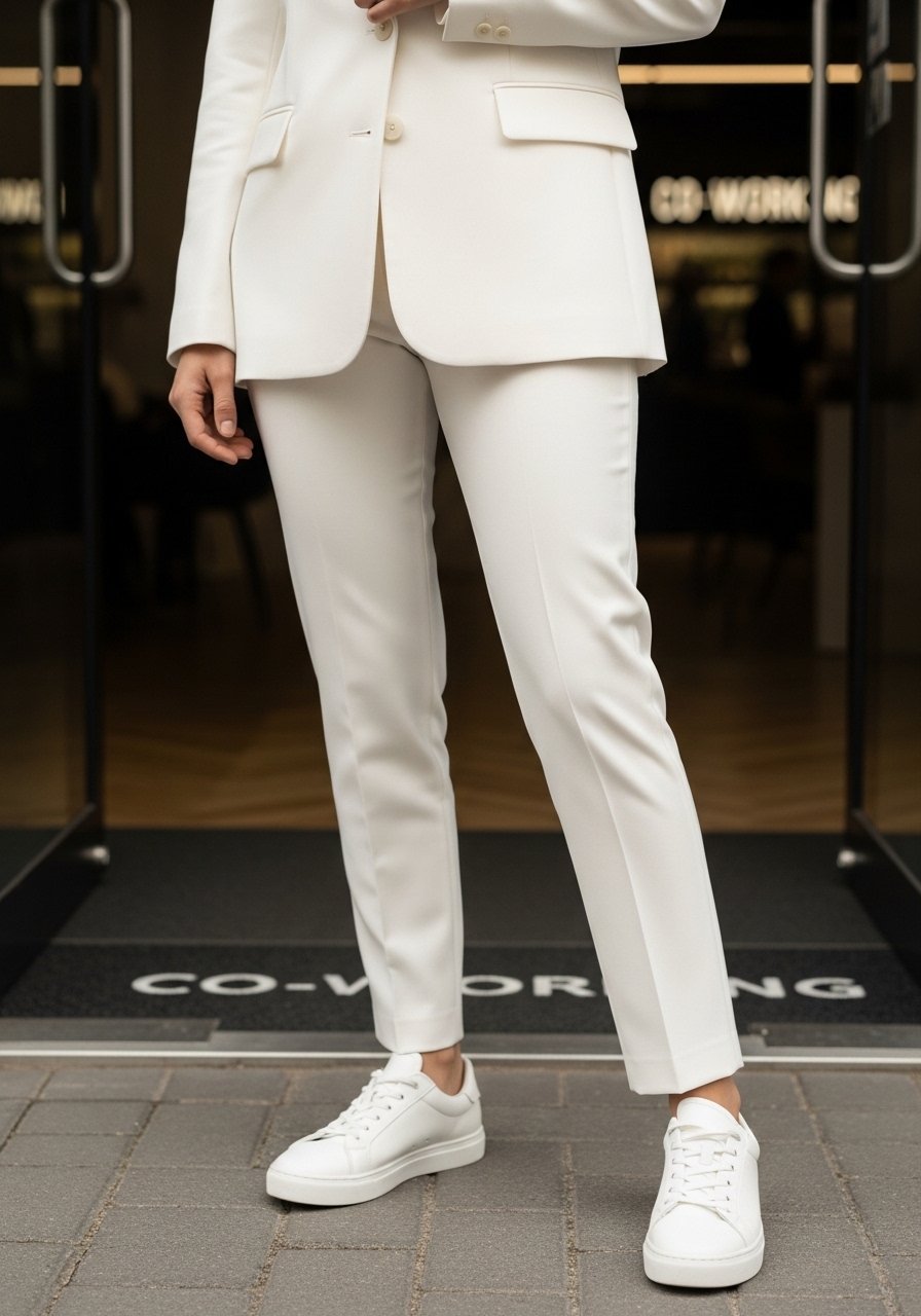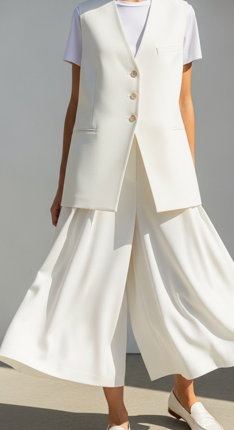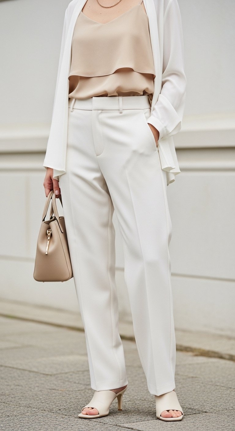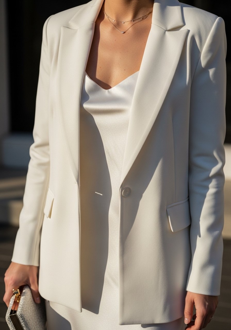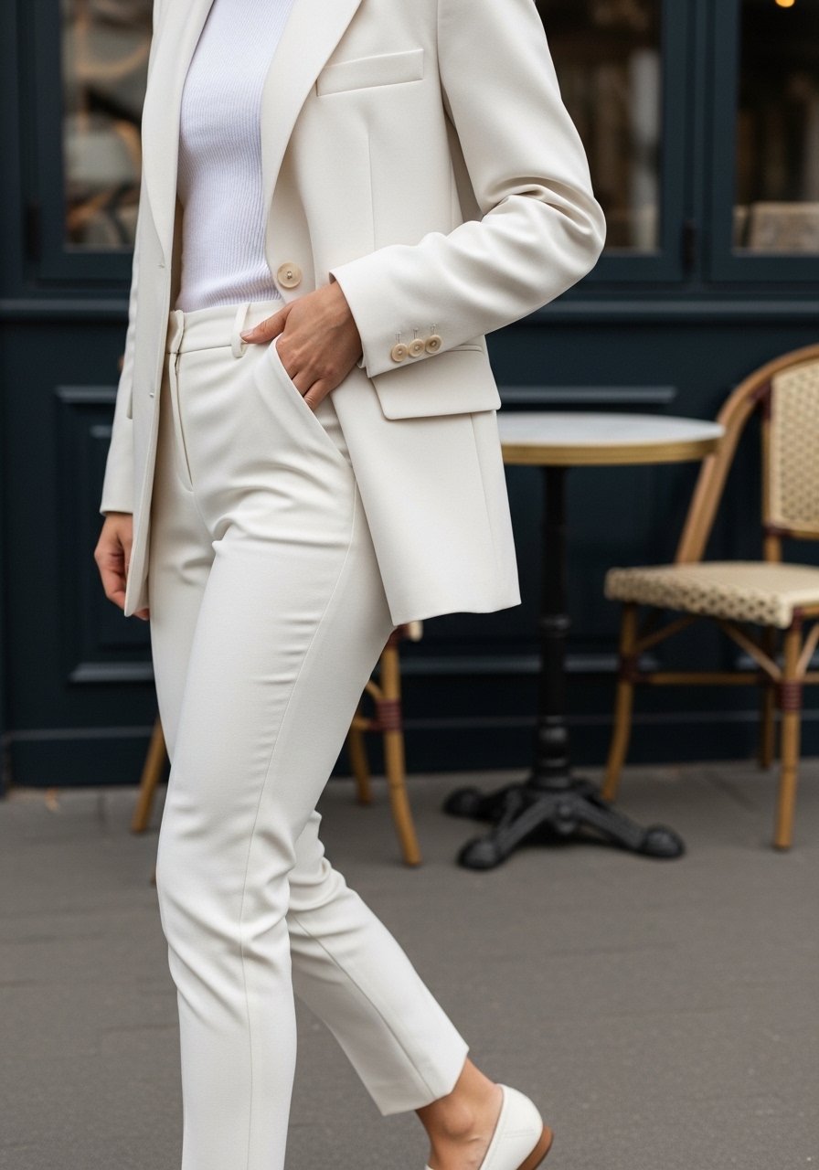 An insight I use: mixing slightly different whites and textures (matte cotton with a soft crepe blazer) keeps the look layered yet cohesive. Mistake to avoid: wearing a blazer that’s too long and boxy with slim trousers—it kills proportion.