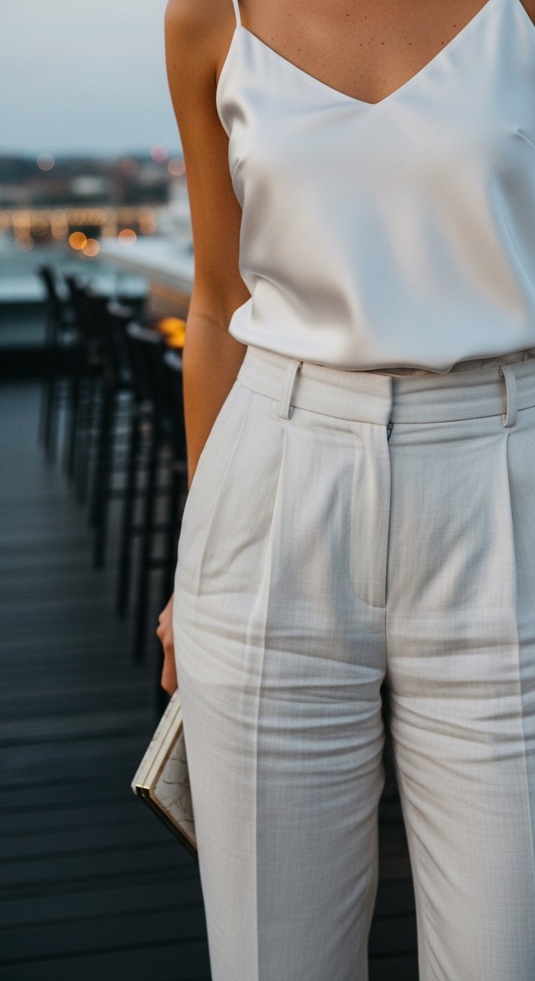 I learned to layer a light blazer when it gets chilly; satin alone can feel exposed. The pants should skim the ankle for a flattering silhouette.