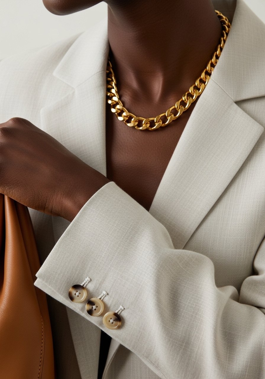 These tiny finishes make white feel lived-in and polished. They prevent the outfit from reading washed out on darker skin.