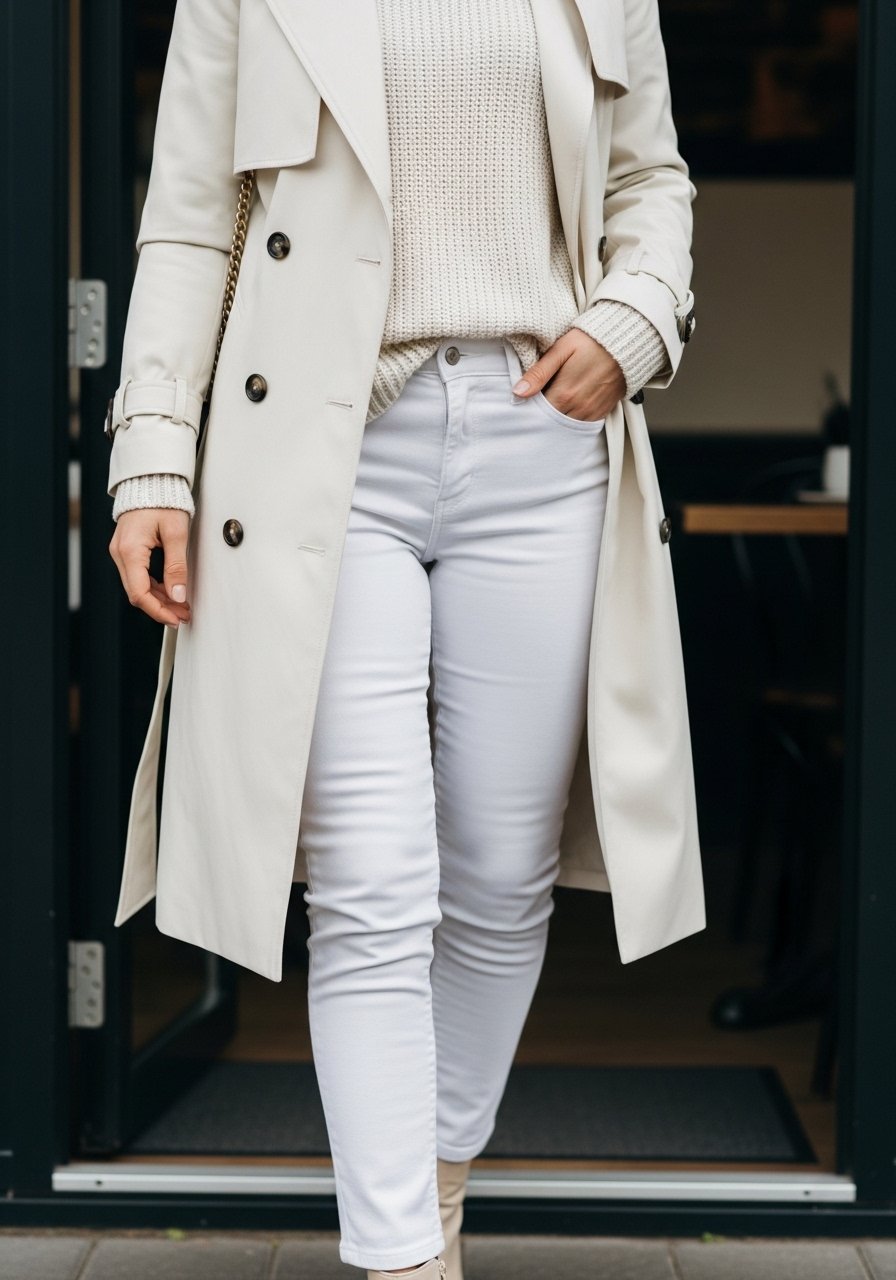 11. Trench Coat Over White Jeans and Knit