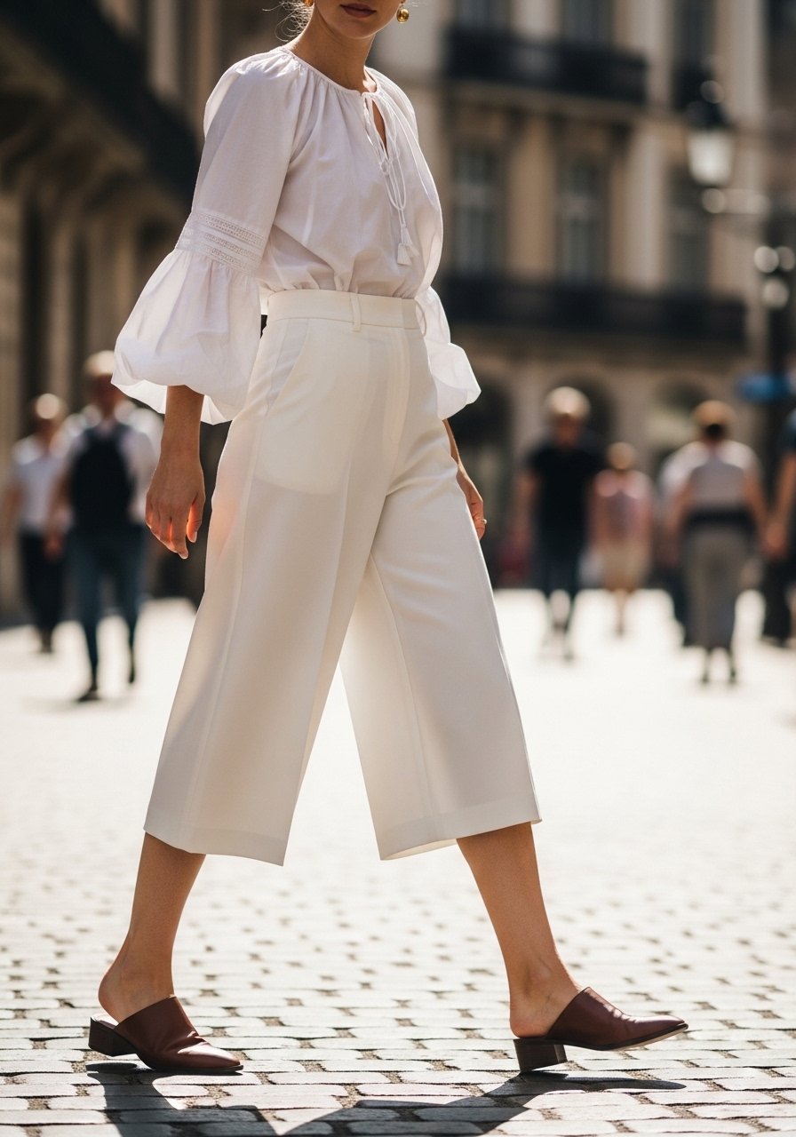 Cropped trousers show a bit of ankle; mules or low heels complete the look with comfort.
