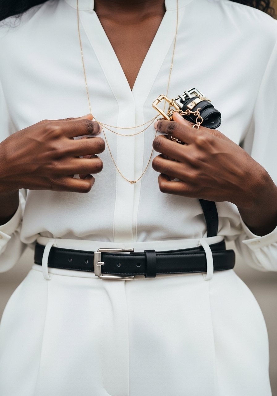 I stand in front of my closet and the all-white outfit looks unfinished. The linen top floats. The trousers feel flat. I know white can read plain on darker skin if I don’t anchor it.