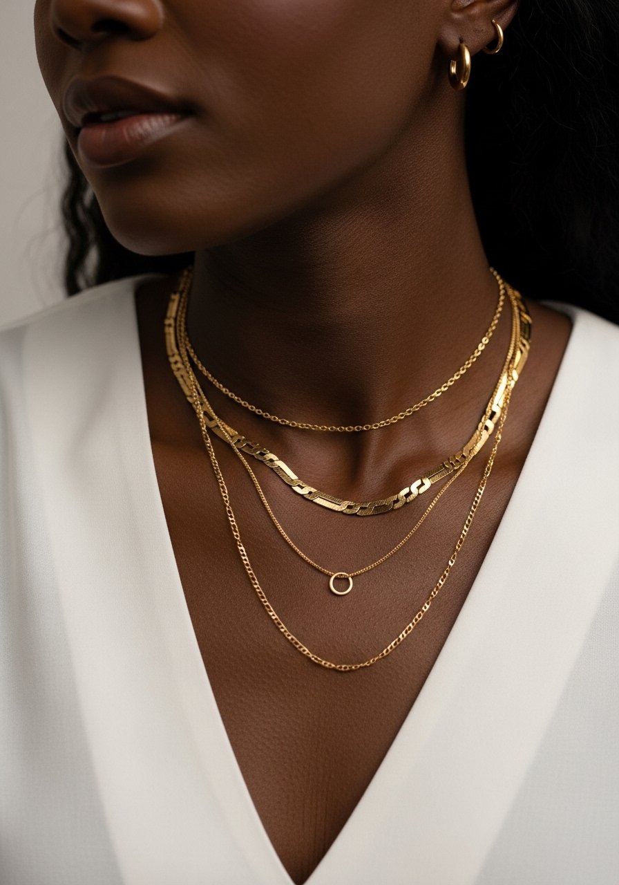 I layer thin gold chains and keep earrings simple. The layers sit close to the face and add warmth. They create subtle movement when I walk.