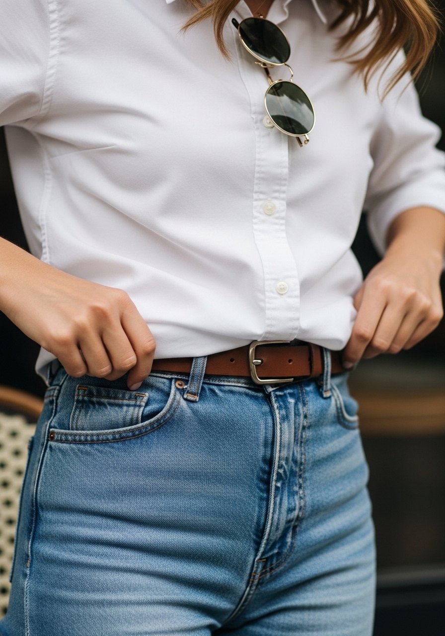 I make a decision about my waistline—tuck, half-tuck, or add a thin belt. That tiny line between top and bottom grounds the outfit. On high-waist trousers, a full tuck elongates my legs. With a looser shirt, a half-tuck keeps things casual but intentional.