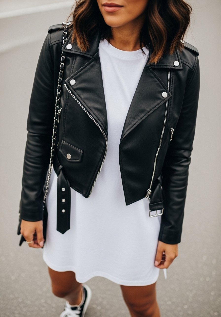I wear this when I want a little edge without overdoing it. The leather adds texture and keeps all-white from looking flat.