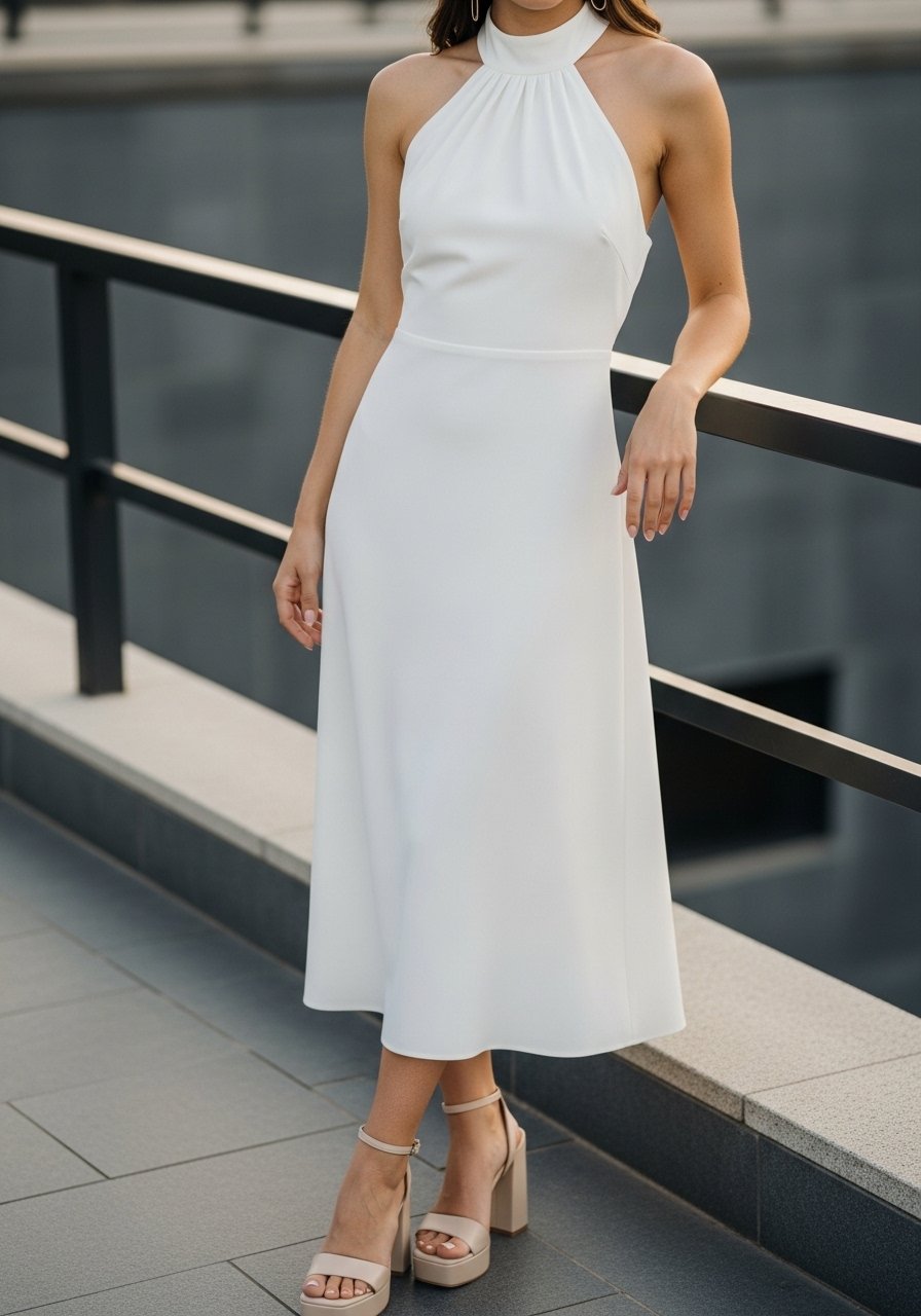 19. White Halter Neck Dress with Block Heels